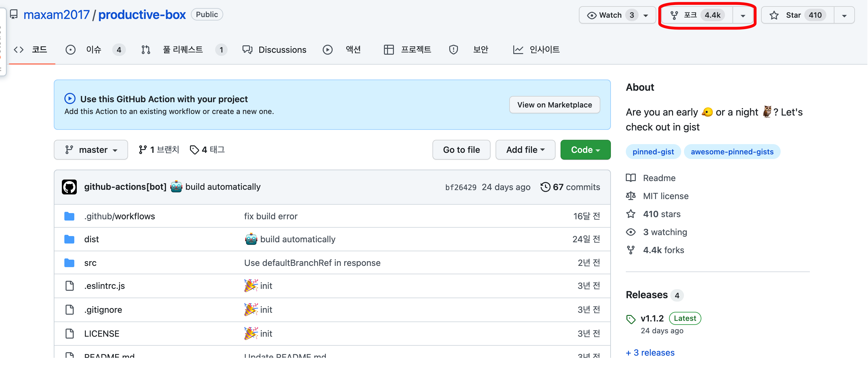 - uses : 본인아이디/projuctive-box@master