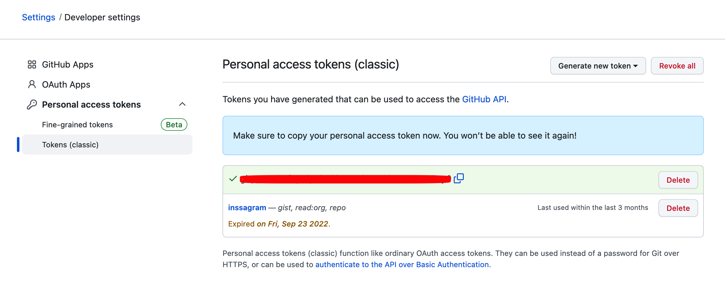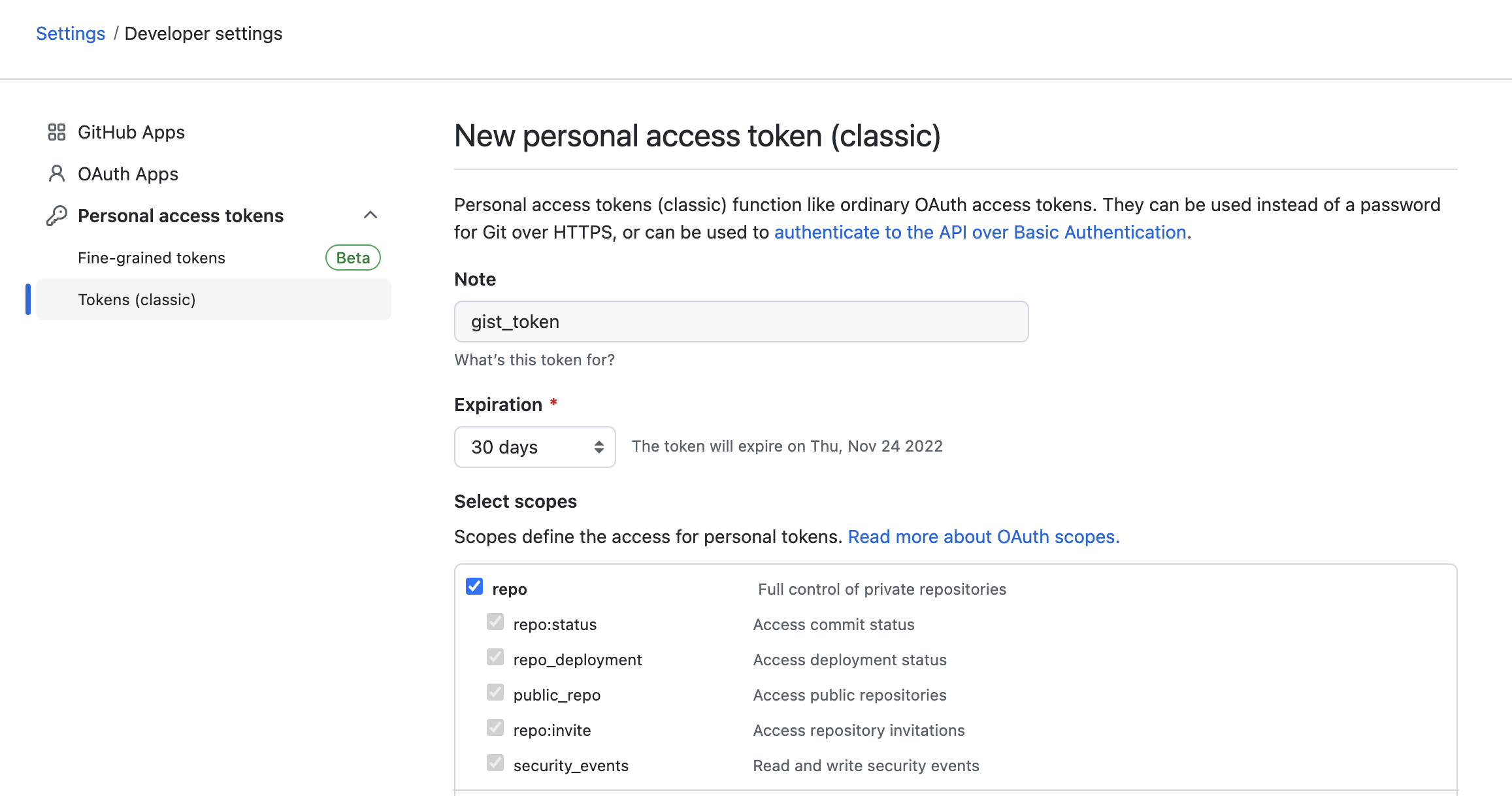 2. 깃허브 토큰 생성 페이지에서 gist와 repo scope 권한을 가진 Token 만들기