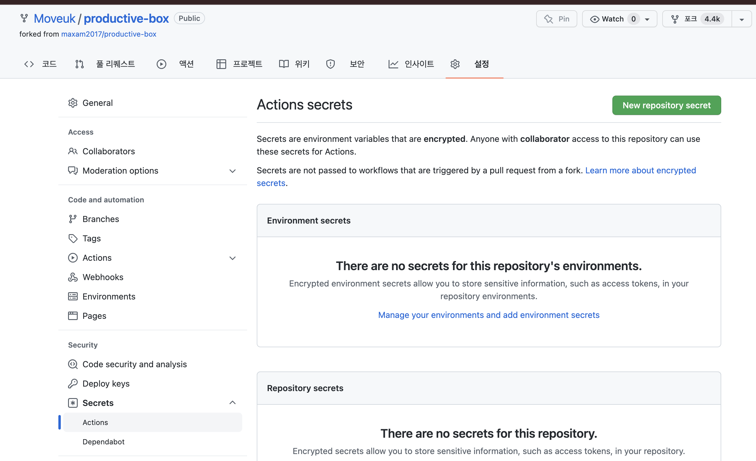 4. 저장소 Settings 탭 > Secrets > Action에서 환경변수를 만들어주기