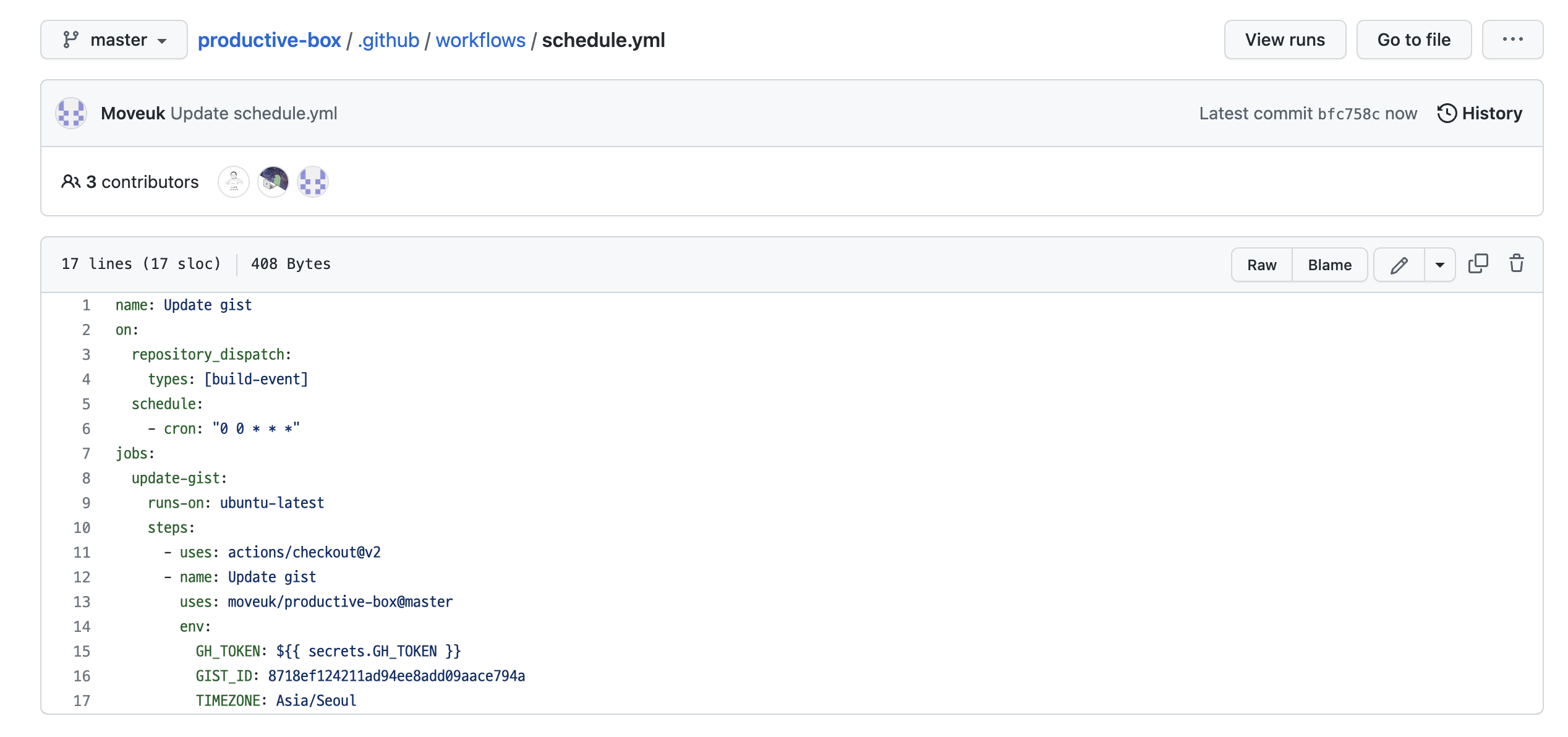 3. 저장소 내부의 `.github/workflow/Schedule.yml `파일을 수정하여 환경변수를 변경하기