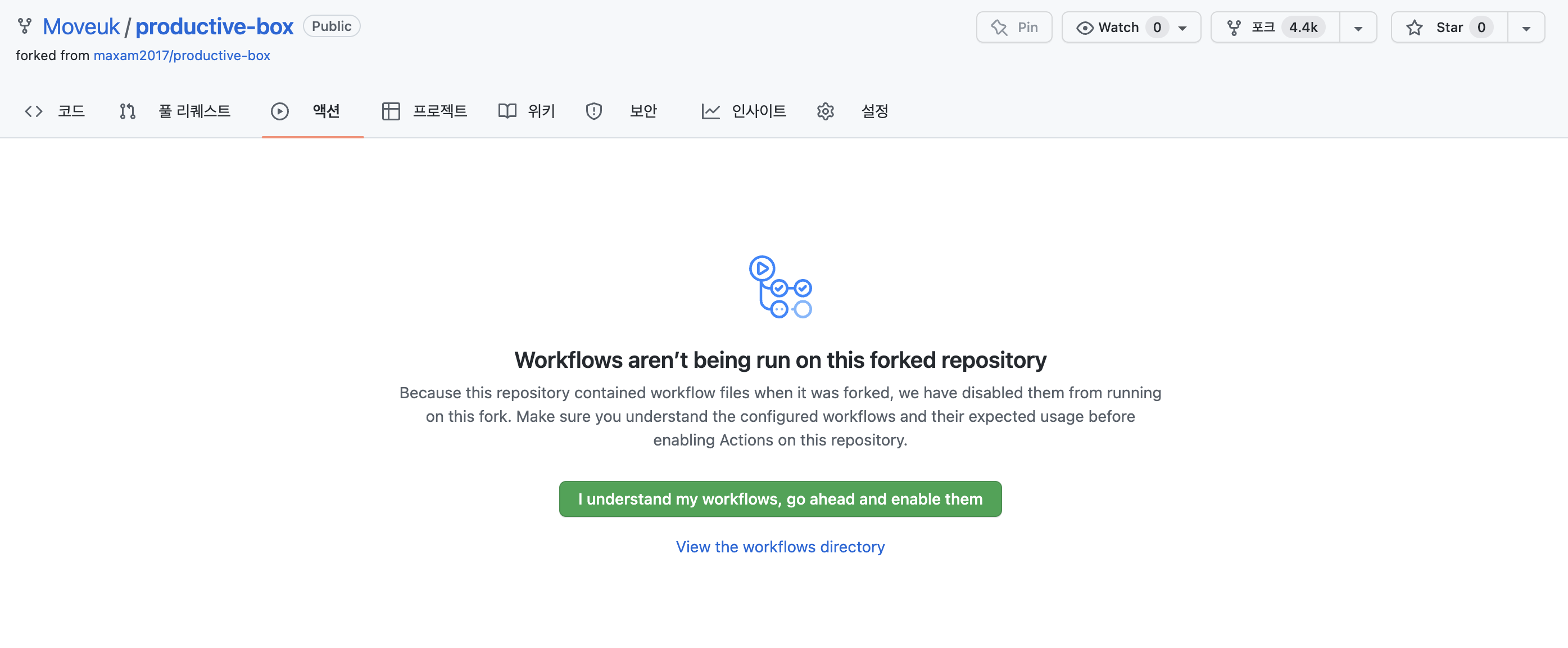 2. fork 해온 나의 repository에서 Action 탭에서 Action을 `enable`로 활성화 하기!