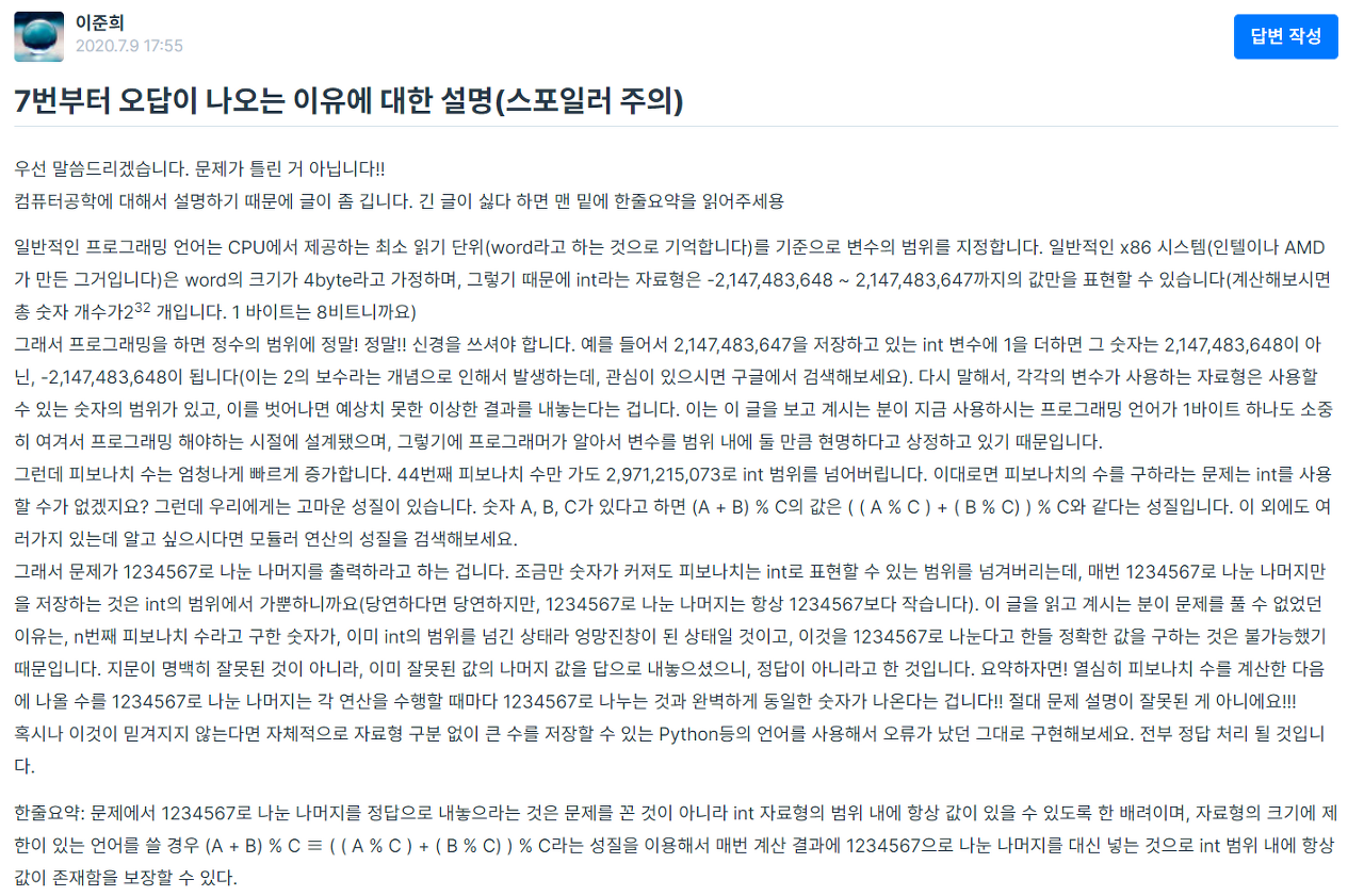 추가로 모듈러 연산에 대한 지식도 알게 되어 추 후 이런 문제가 나올 경우 도움이 많이 될 듯 싶다.