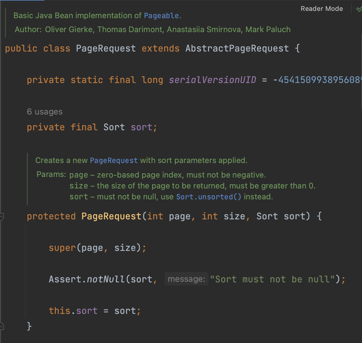 Pageable 인터페이스는 PageRequest를 기본적인 구현체로 두고 있으며 실질적인 값은 PageRequest 객체가 들어가게 된다.