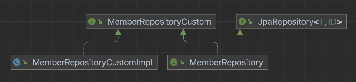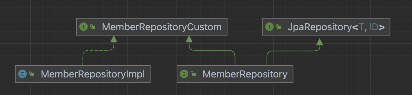 마지막으로, 사용자 정의 레포지토리를 사용할 MemberRepository에서 JpaRepository와 함께 MemberRepositoryCustom을 함꼐 extends 받으면 MemberRepository가 Spring에 의해 구현될 때 Impl이 접미사로 붙은 클래스를 찾아 구현하게 된다. 2.x 버전 부터는 사용자 정의 인터페이스인 MemberRepositoryCustom에 Impl을 붙여 작성해도 사용이 가능하다.