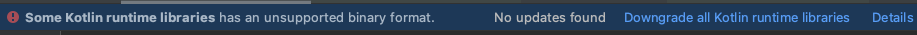 인텔리 제이 상단에 다음과 같은 안내(some kotlin runtime libraries has an unsupported binary format)가 떴다. 또한, 자동완성? kotlin 용 live templates이 작동하지 않는 것 같아서 문제를 느꼈다.
