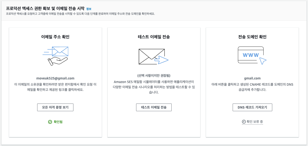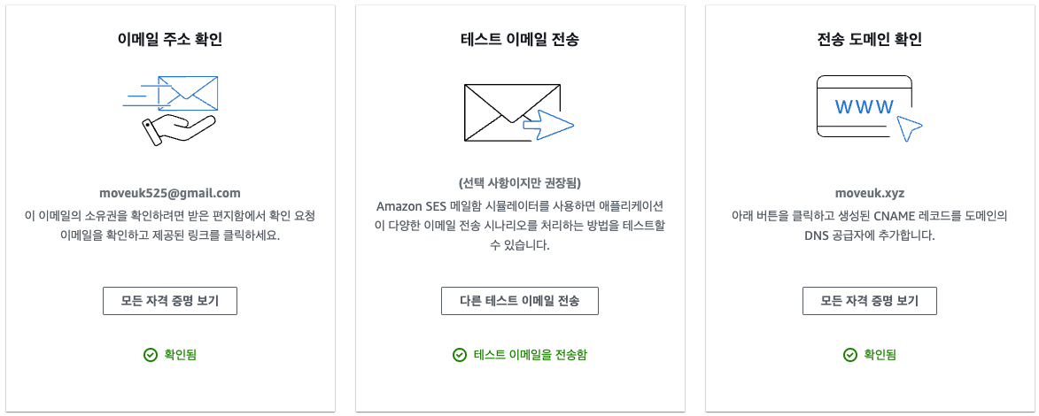설정하고 좀 기다리면 아마존 SES에서 다음과 같이 인증됨이 확인된다.