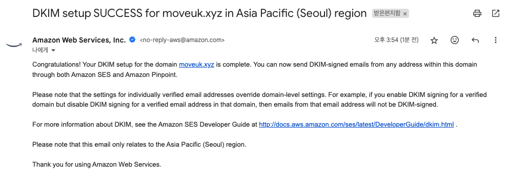또한 DKIM 설정이 잘 되었다고 이메일이 온다.