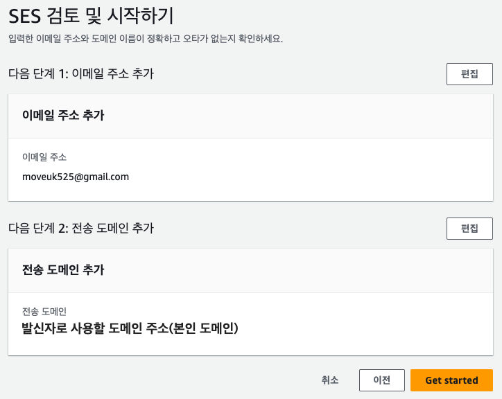 맨 처음 아마존 SES를 시작하기를 누르게 되면 다음과 같이 이메일 주소와 전송 도메인을 추가하는 화면이 뜨게 된다.