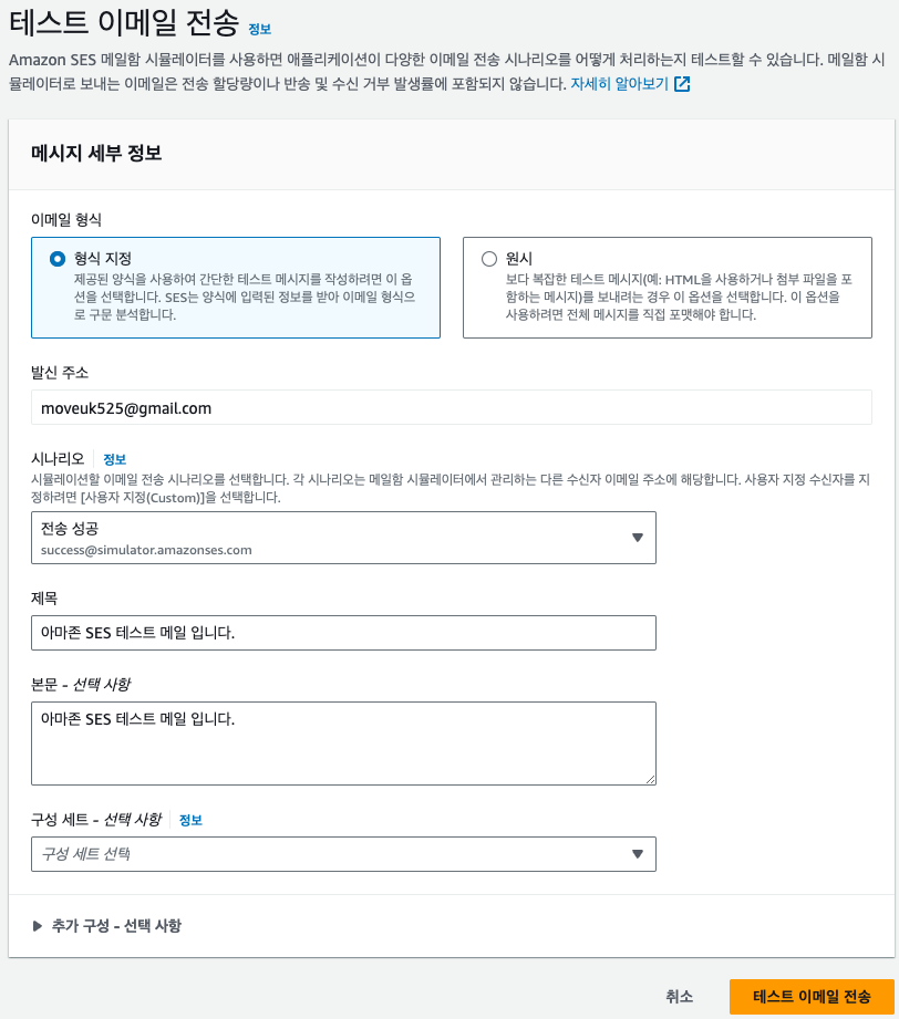 이메일 주소: 프로덕션 전에 이메일 테스트를 해볼 수 있는 본인의 이메일 주소. 추후 아마존으로부터 날라온 메일을 통해 본인 인증 절차를 거쳐야 사용할 수 있다.