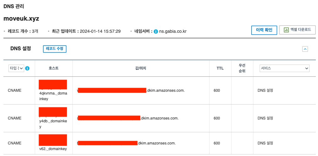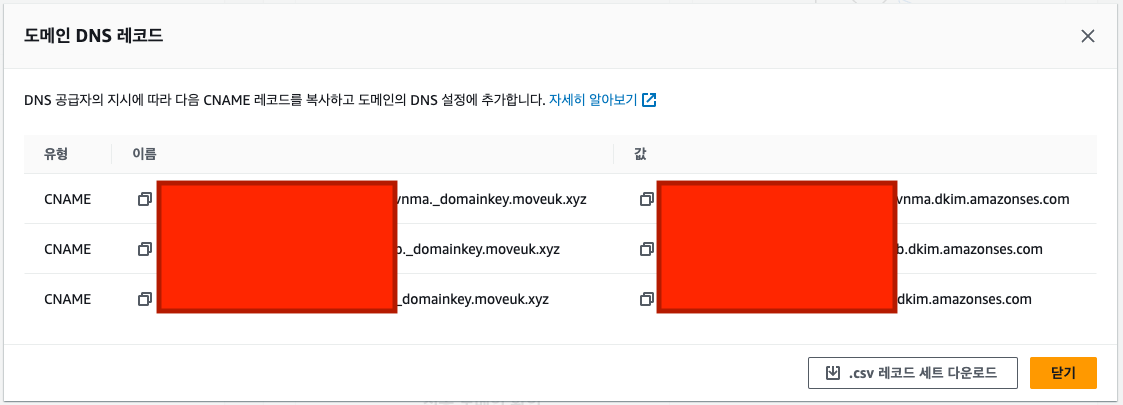 아마존 SES는 DKIM을 이용해 우리 서버의 도메인이 네이버, 구글과 같은 정상적인 인증된 도메인이라는 것을 인증시켜준다. 우리는 그것을 도메인 서버가 통신시 사용할 수 있도록 도메인 서버에게 알려주기 위해 설정을 한다고 생각하면 된다.(내가 이해한 부분.)