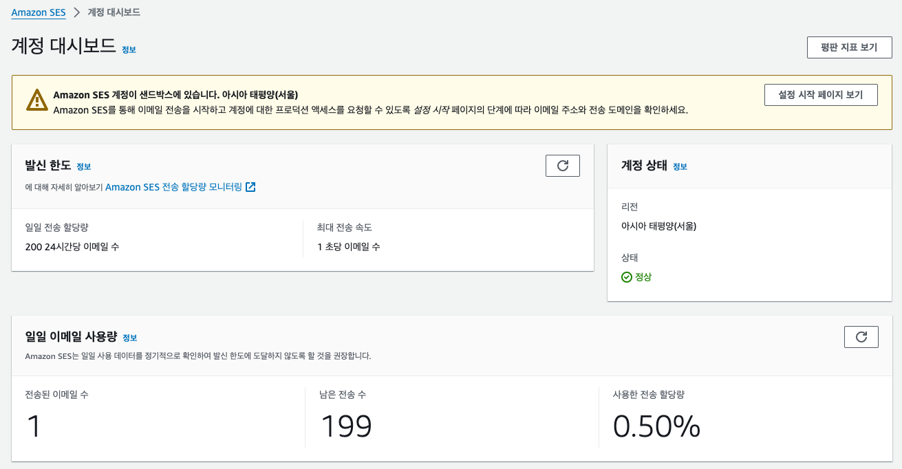이제 아마존 SES 콘솔로 가보면 사용 가능한 것을 확인할 수 있고 우리가 테스트를 위한 설정을 마저 해주어야 한다고 알림이 뜬다.