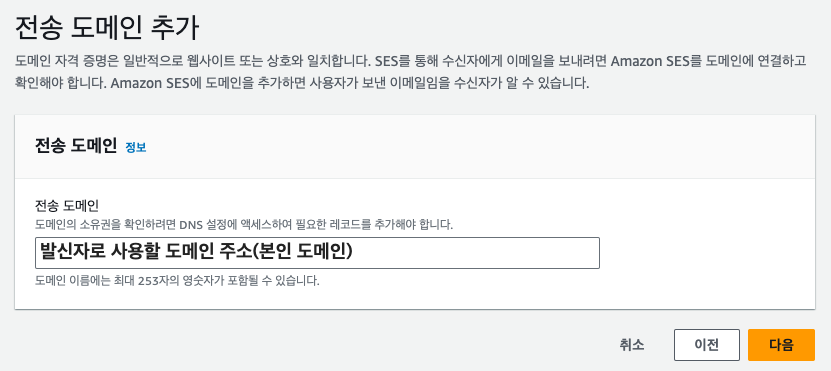 전송 도메인: 우리가 메일을 보낼 때 사용할 발신 도메인을 명시한다. 이 또한, 도메인 업체에 DKIM이라는 것을 통해 이 도메인이 인증된 도메인이라는 것을 알려줄 수 있도록 CNAME을 등록해주어야 한다.