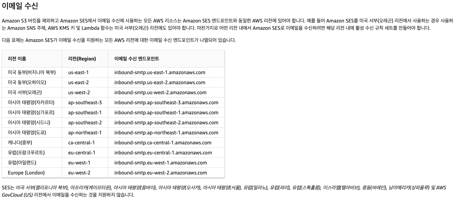 이 글에서는 도메인을 발신자로 만들어 메일을 보내는 것까지만 실습을 진행합니다. 만약 수신 기능까지 원하신다면 (예를들어 피드백 메일 등..) 서울 리전이 아닌 다른 리전에서 서비스를 이용하셔야 합니다. 가능한 리전은 아래에 첨부하겠습니다.