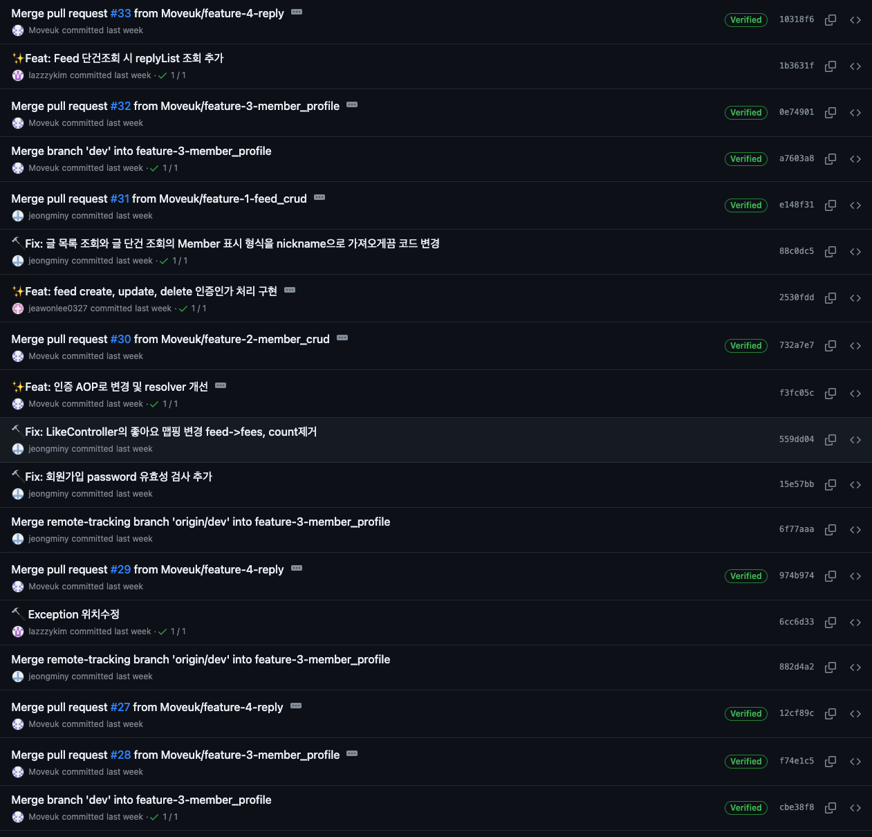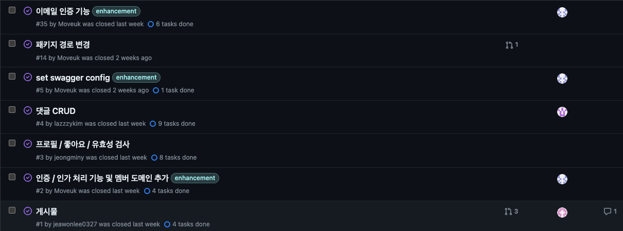 - 이슈를 사용하는 것 또한 적극적으로 진행했고, 팀원 모두가 익숙해진 것 같았다.