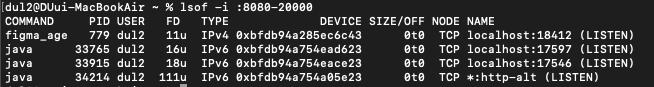 $ lsof -i :8080-20000