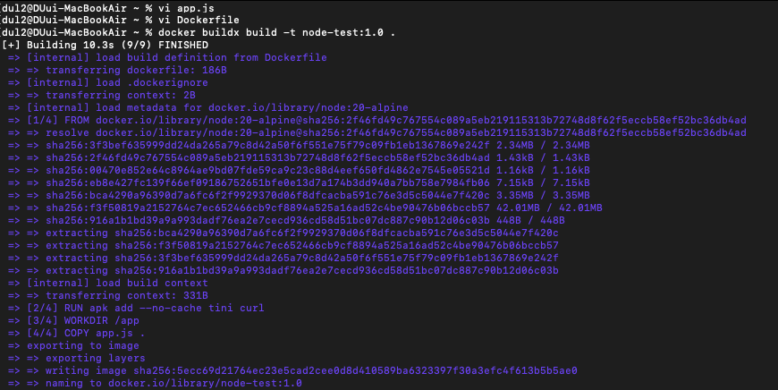 이미지를 직접 빌드할 수 있다. 다음 명령어는 docker image를 직접 빌드할 수 있는 명령어이다. 빌드를 하게 되면 아래 사진처럼 로그가 나오고 빌드가 된다.