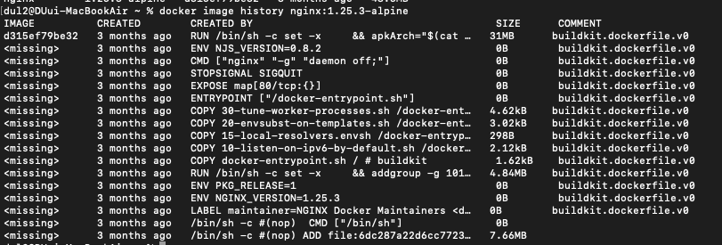 아래 명령어를 입력하면 여러 개의 계층 구조로 된 도커 이미지를 확인할 수 있다.