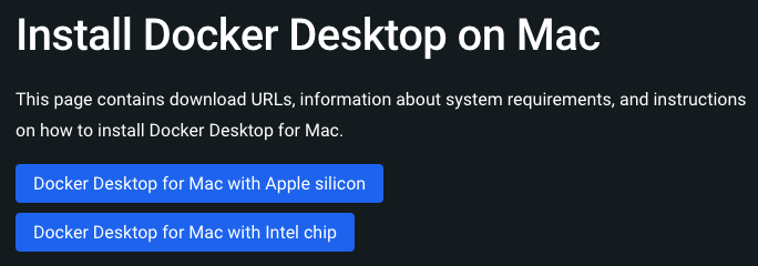 https://docs.docker.com/desktop/install/mac-install/ 로 이동하여 본인 chip에 따라 설치.