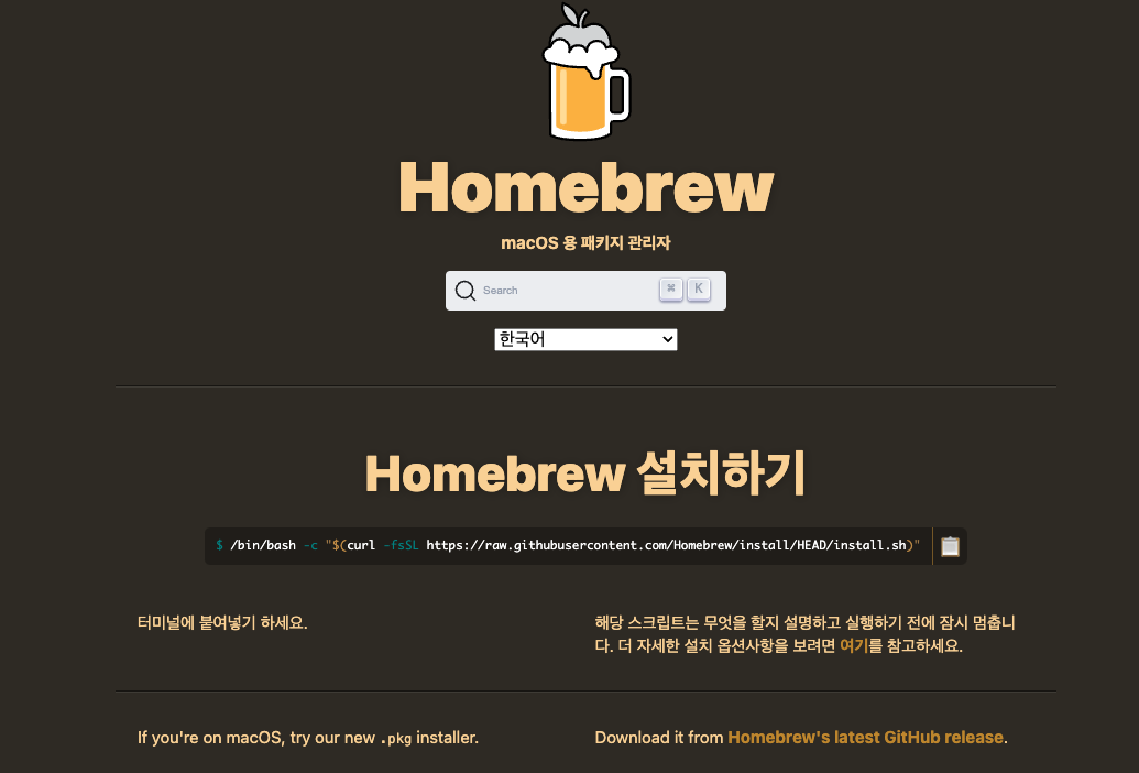 brew(homebrew)는 각종 커맨드라인 프로그램과 일반 애플리케이션을 손쉽게 설치해주는 Mac용 패키지 매니저이다. 리눅스의 apt나 yum과 비슷하며 다양한 프로그램을 복잡한 빌드과정 없이 손쉽게 설치하고 업데이트, 관리도 간단하게 진행할 수 있다.