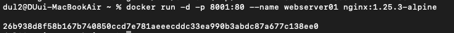 docker run -d -p 8001:80 --name webserver01 nginx:1.25.3-alpine