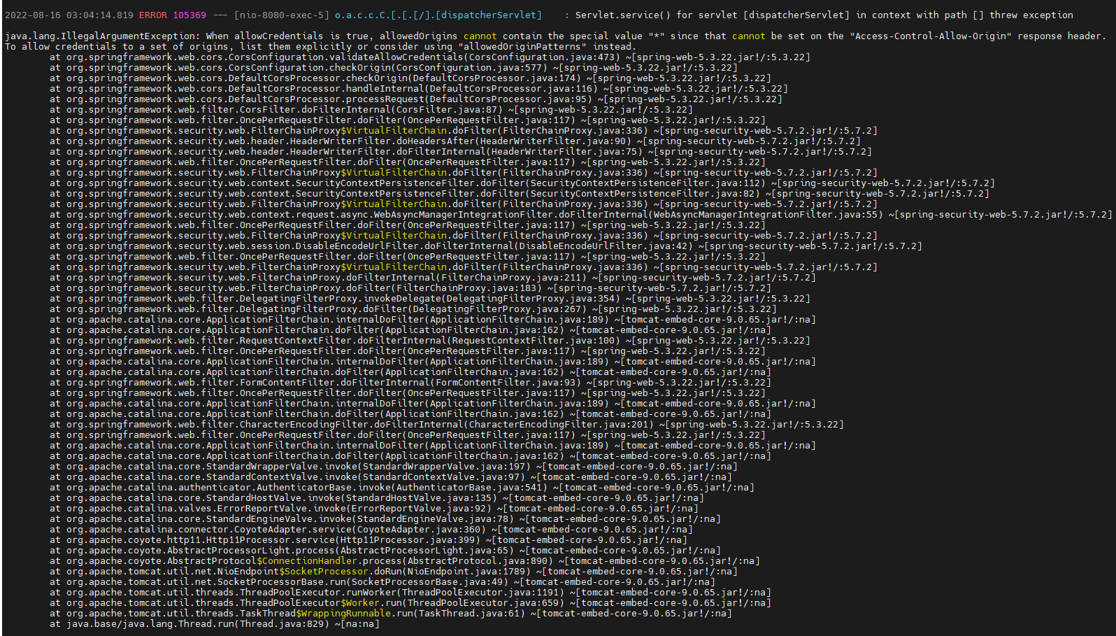 - 스프링 부트 2.4.0 버전 이상부터 "allowCredentials 가 true일 때 allowedOrigins의 값이 "*"이면 안된다"는 에러 문구처럼 설정할 수 없었고 대신 allowOriginPatterns를 사용해야 한다고 한다.