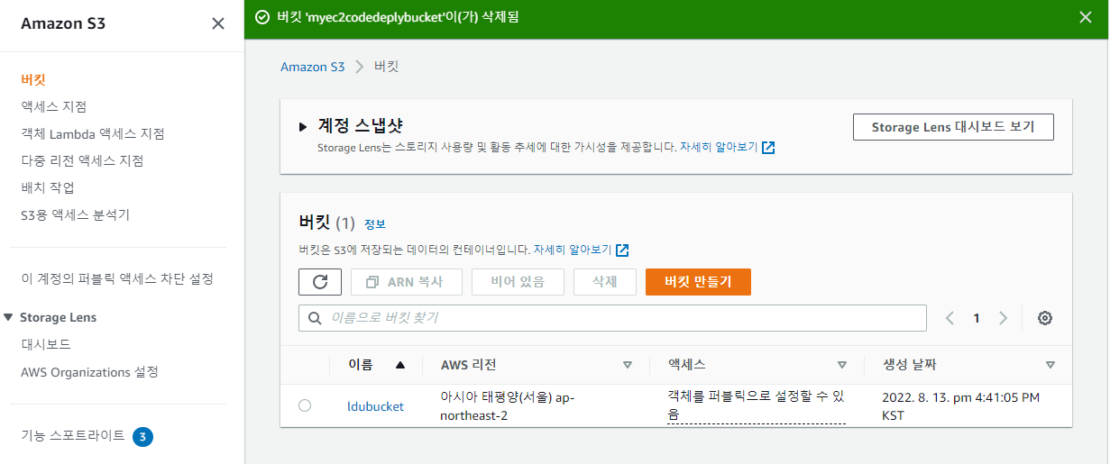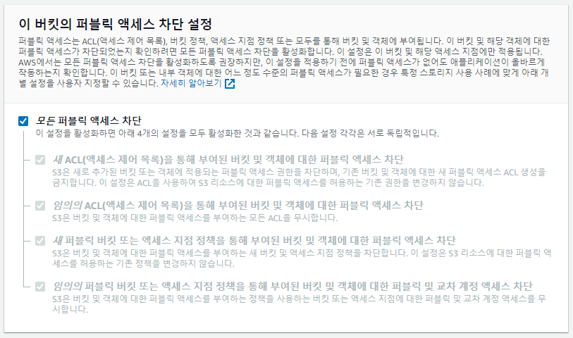 퍼블릭 액세스 접근은 모두 차단해야 합니다. 이유는 배포 파일을 아무나 자유롭게 접근이 가능하다면 배포 파일 내부의 주요 키값들을 탈취 당할 수 있기 때문입니다. 우리는 IAM 사용자의 키값을 이용해 접근하므로 사용하는데 지장이 없습니다.