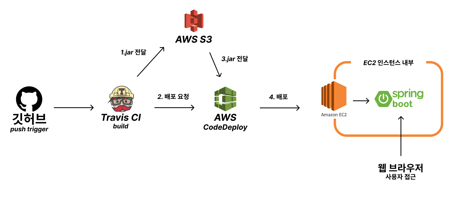 간단하게 피그마를 이용하여 Travis와 S3가 어떤 역할을 하고 어떤 방식으로 배포 자동화가 이루어지는 지 책에 있는 그림을 다시 그려보았습니다.