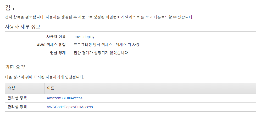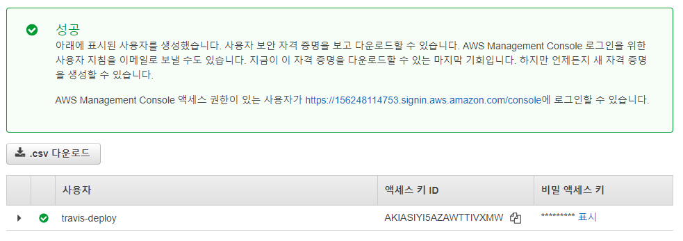 사용자를 만들게 되면 다음과 같은 액세스 키와 비밀 액세스 키가 발급됩니다. 이 키들을 Travis CI에서 사용할 예정입니다.